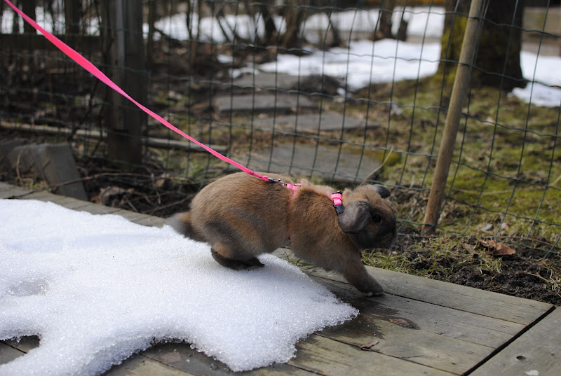 Yritettiin myös vähän totuttaa koiraamme Vinjaan, mutta ihan vielä ei siinä onnistuttu. Olisi nimittäin paljon helpompaa jos koira olisi tottunut kaniin. Olin Vinjan kanssa takapihalla ja siskoni raotti pihan ovea, jotta Mauski (koiramme siis jos joku ei vielä tiedä) näki Vinjan. Mauski oli sekä valjaisiin että pantaan puettu ihan varmuuden vuoksi. Heti kun ovi avattiin ja Mauski näki Vinjan niin alkoi hirveä räyhääminen... Sitä kesti niin kauan kunnes ovi suljettiin. Voisi kuvitella, että Vinja meni moisesta metelöinnistä ihan paniikkiin, mutta ei todellakaan! Koko aikana Vinja tuskin edes huomasi, että koira haukkuu sille melko ärhäkkäästi. :D Joten ainakin Vinjan osalta totuttaminen on helppoa.